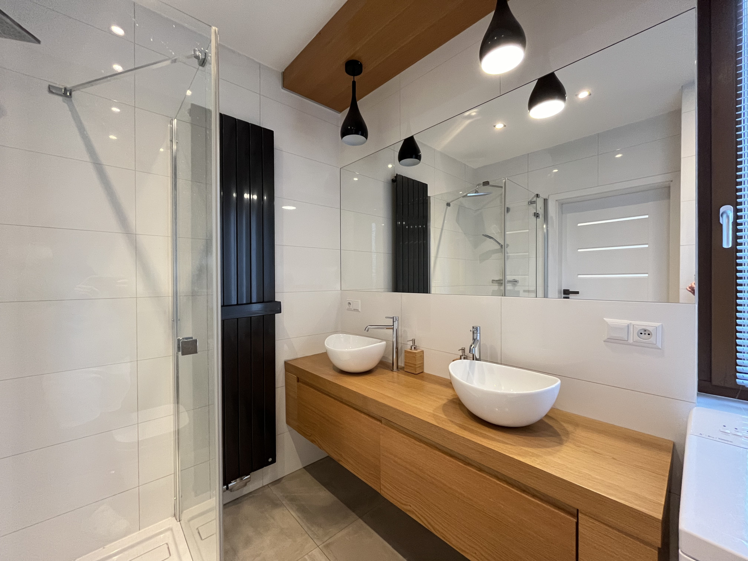 - Funkcjonalnością: wygodny korytarz z pojemną, zabudowaną szafą, elegancka łazienka z podwójnymi umywalkami, przestronnym prysznicem oraz nowoczesną pralką, oraz przytulna sypialnia stanowią idealną przestrzeń dla najbardziej wymagających.