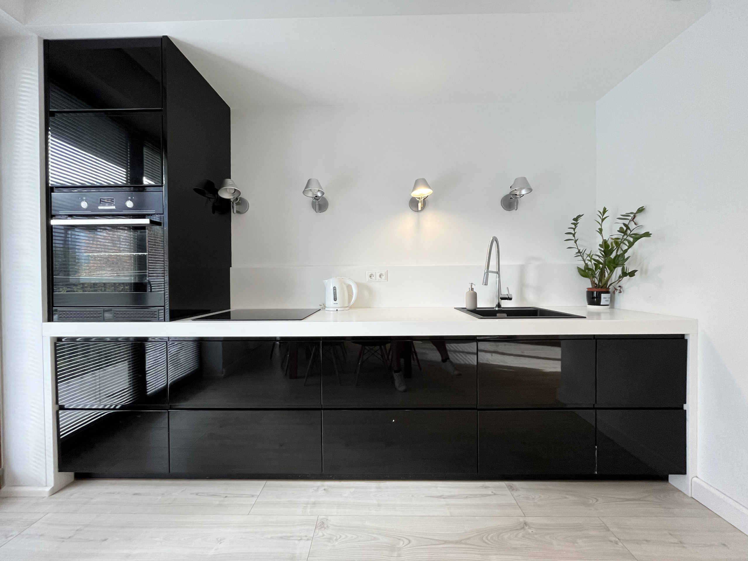 - Pełnym wyposażeniem: kuchnia wyposażona w wysokiej klasy sprzęty AGD, w tym zmywarka, lodówka, piekarnik, płyta elektryczna, a salon z komfortową kanapą i TV.