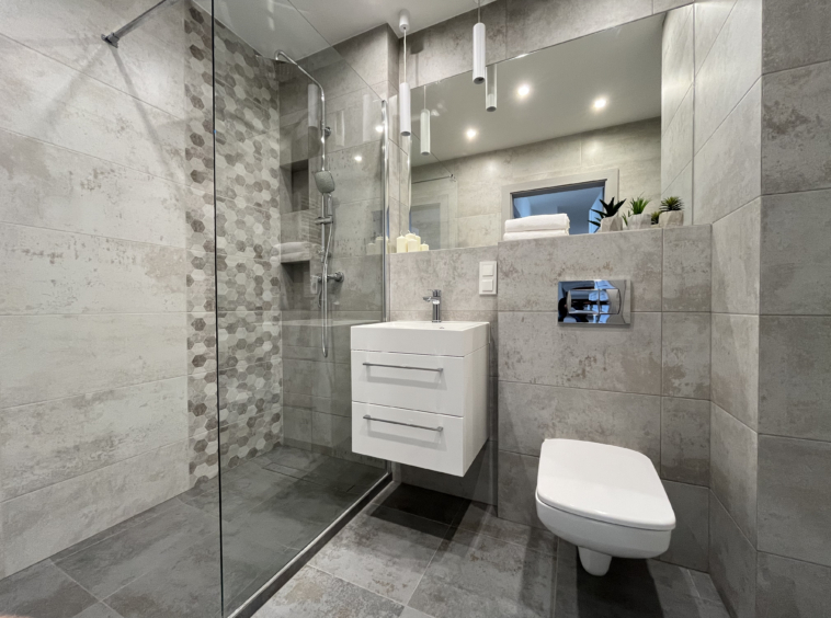• Łazienka jest nowoczesna i praktyczna, wyposażona w kabinę prysznicową, umywalkę, WC i zabudowaną na ścianie szafą;