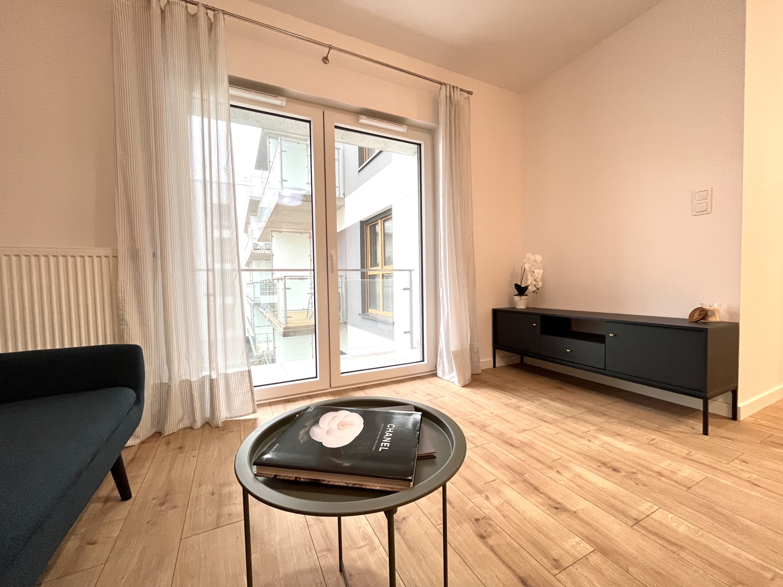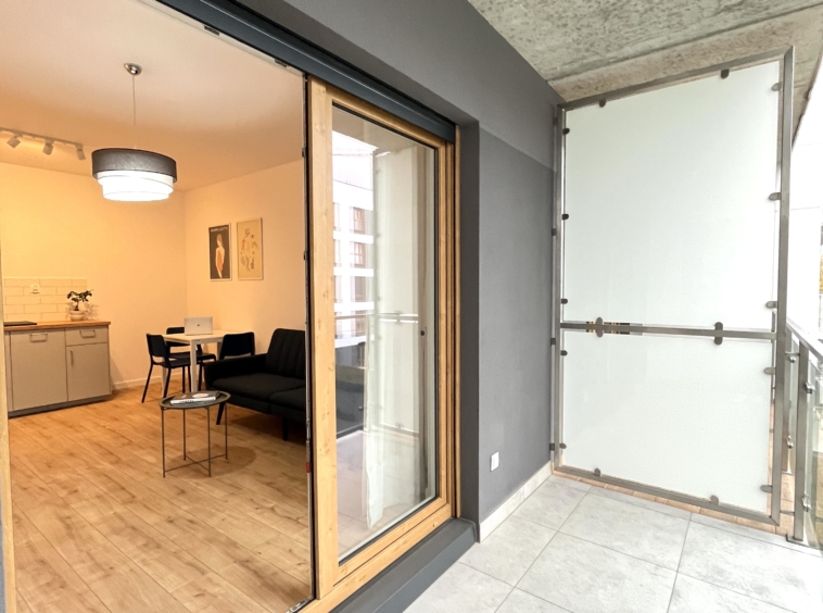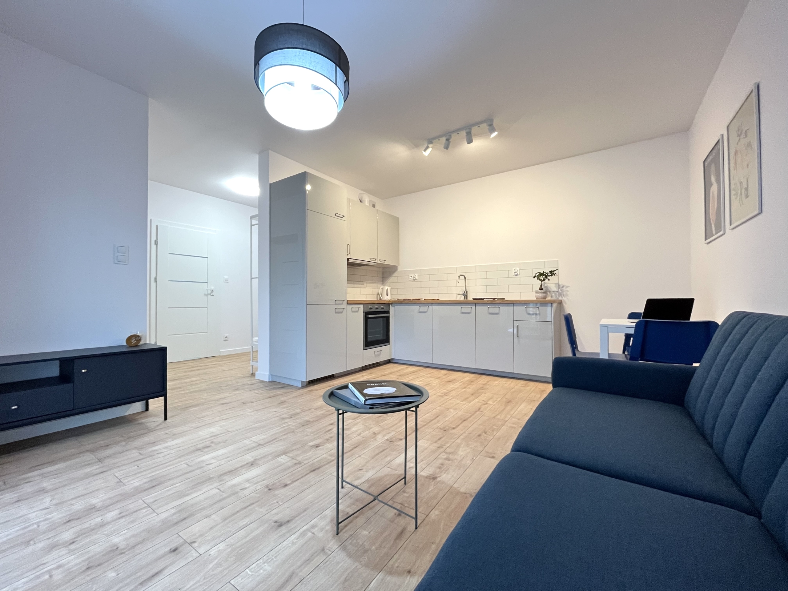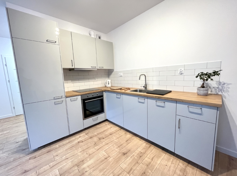 Przestronny, jasny salon z wygodną sofą, stołem jadalnianym i wyjściem na przestronny balkon. Aneks kuchenny został wyposażony w wysokiej jakości sprzęt AGD: lodówkę, kuchenkę, piekarnik, okap oraz zmywarkę.