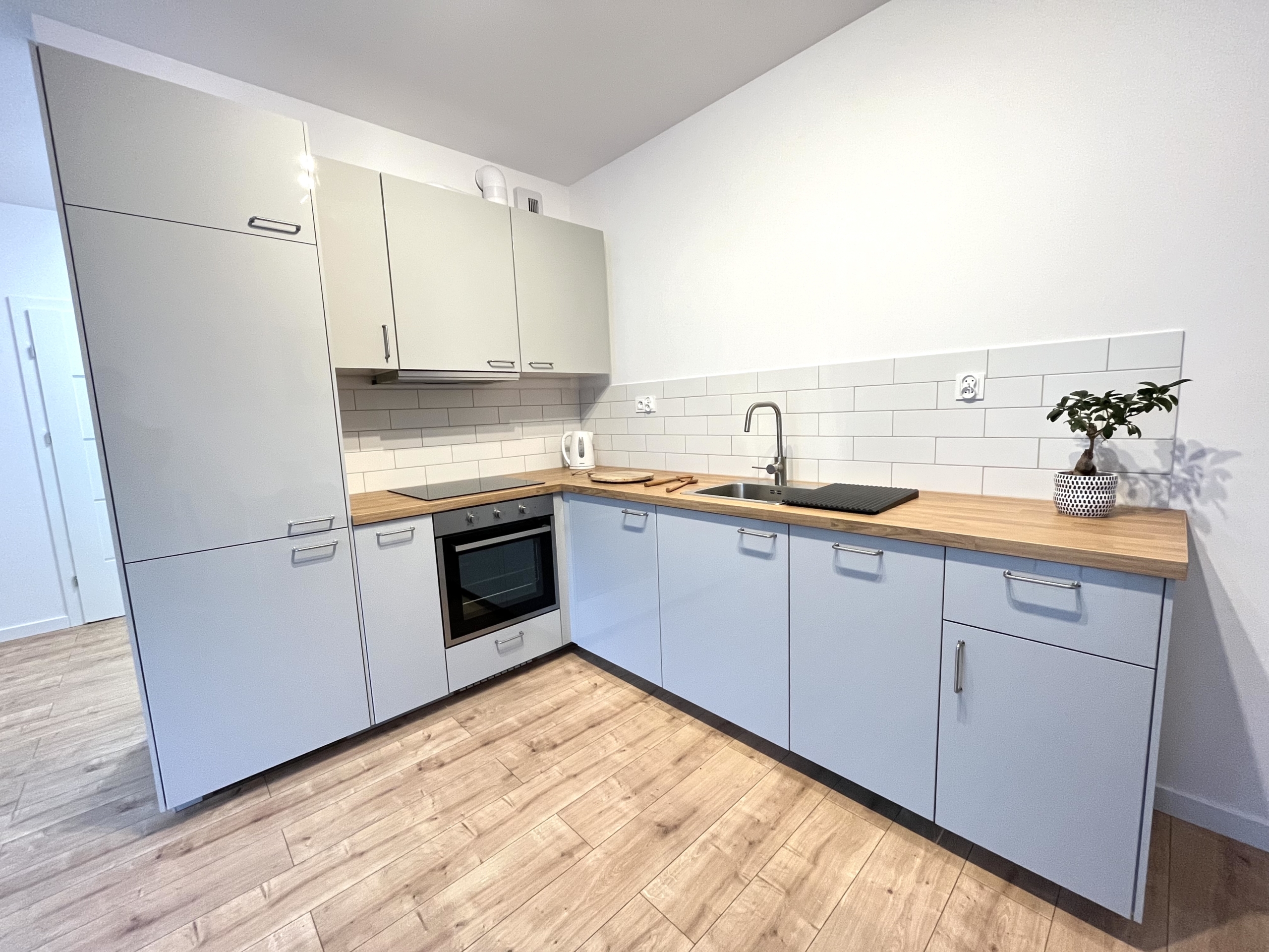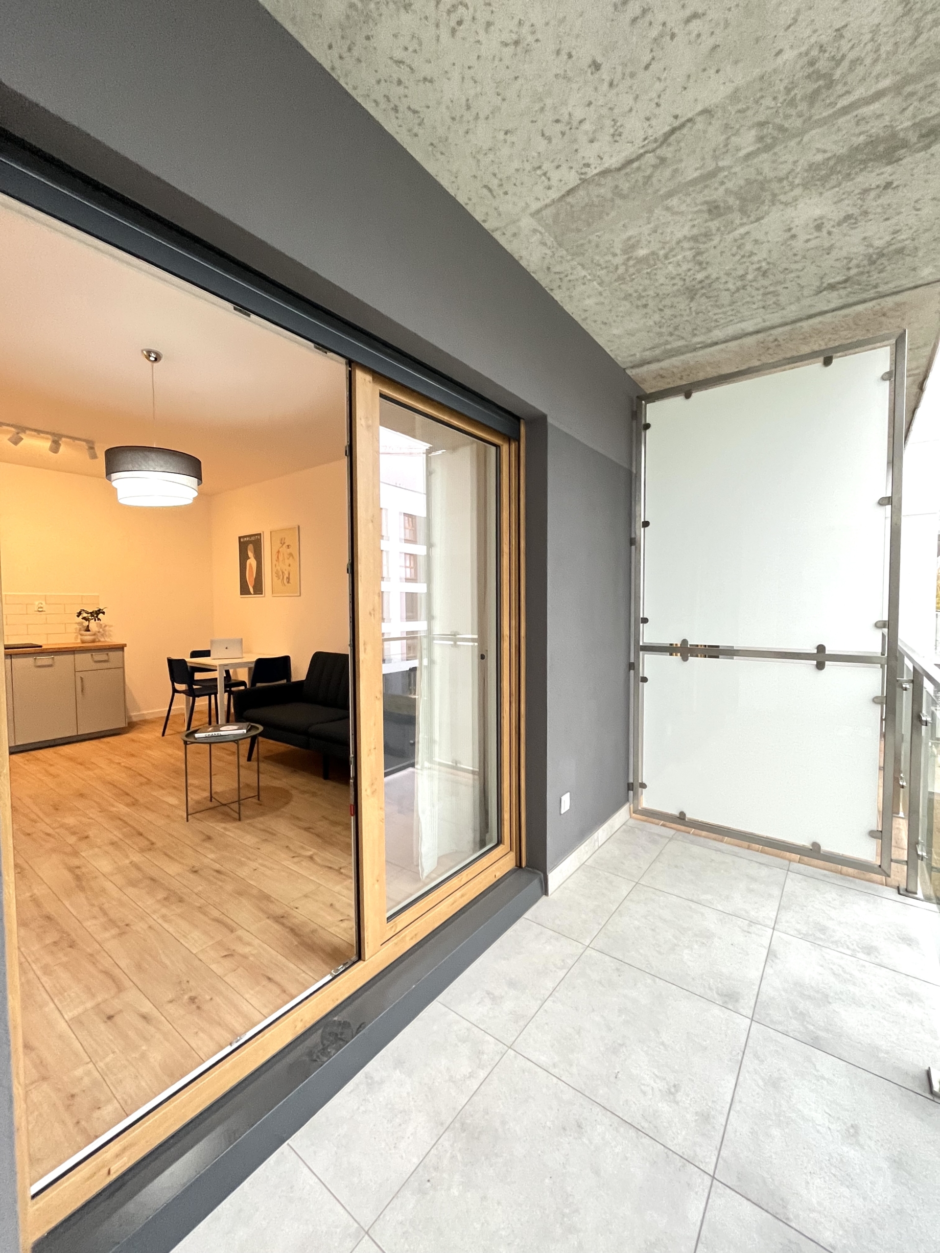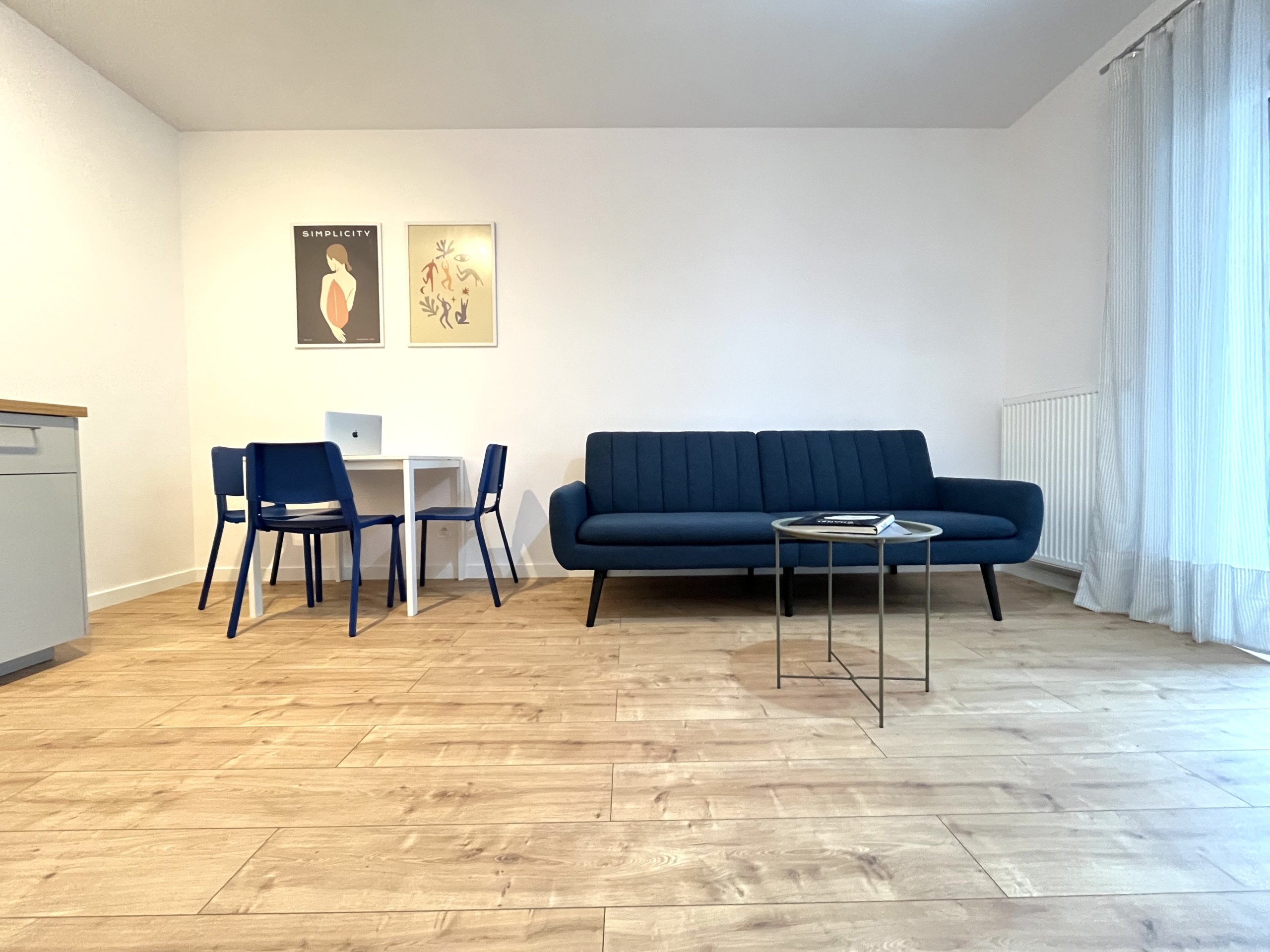 Przestronny, jasny salon z wygodną sofą, stołem jadalnianym i wyjściem na przestronny balkon. Aneks kuchenny został wyposażony w wysokiej jakości sprzęt AGD: lodówkę, kuchenkę, piekarnik, okap oraz zmywarkę.