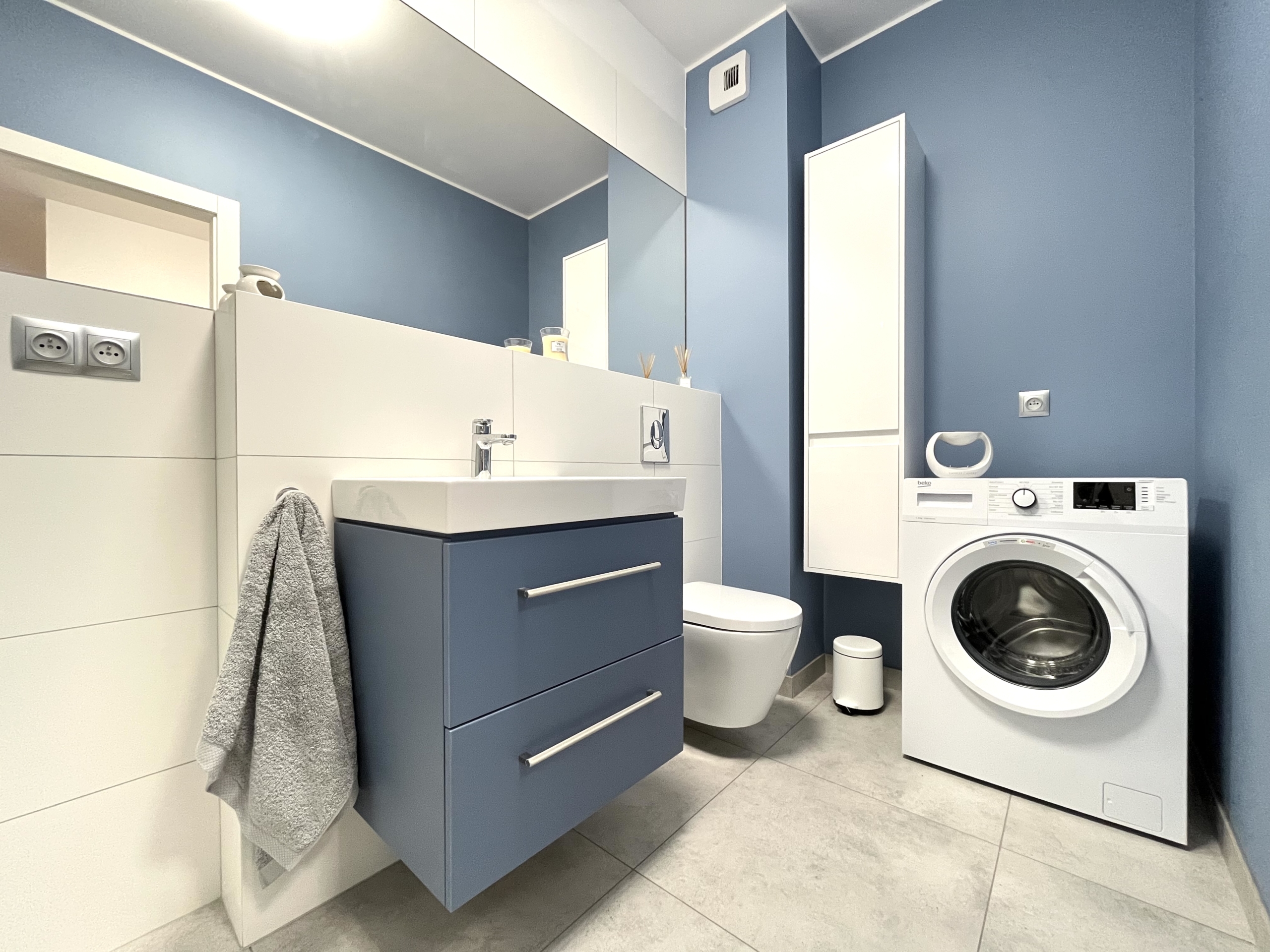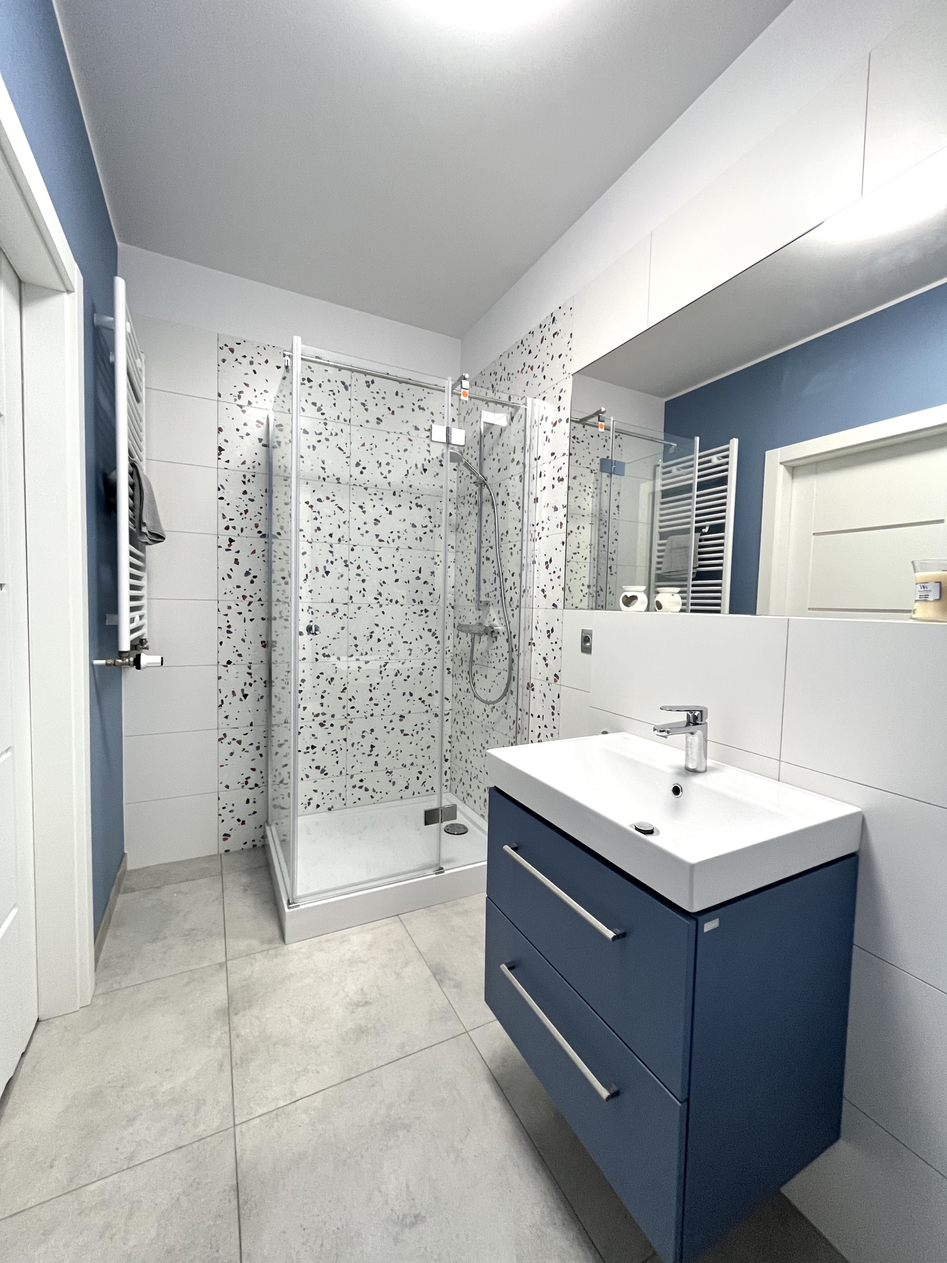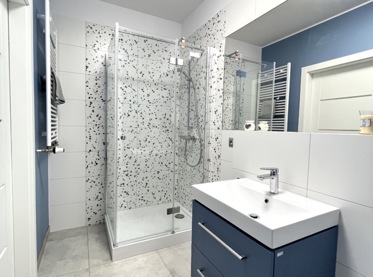 Nowoczesna i funkcjonalna – z kabiną prysznicową, umywalką i pralką.