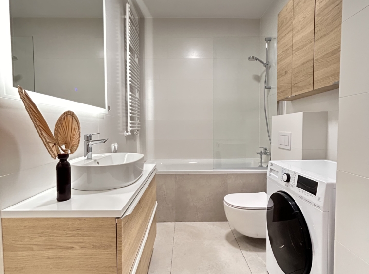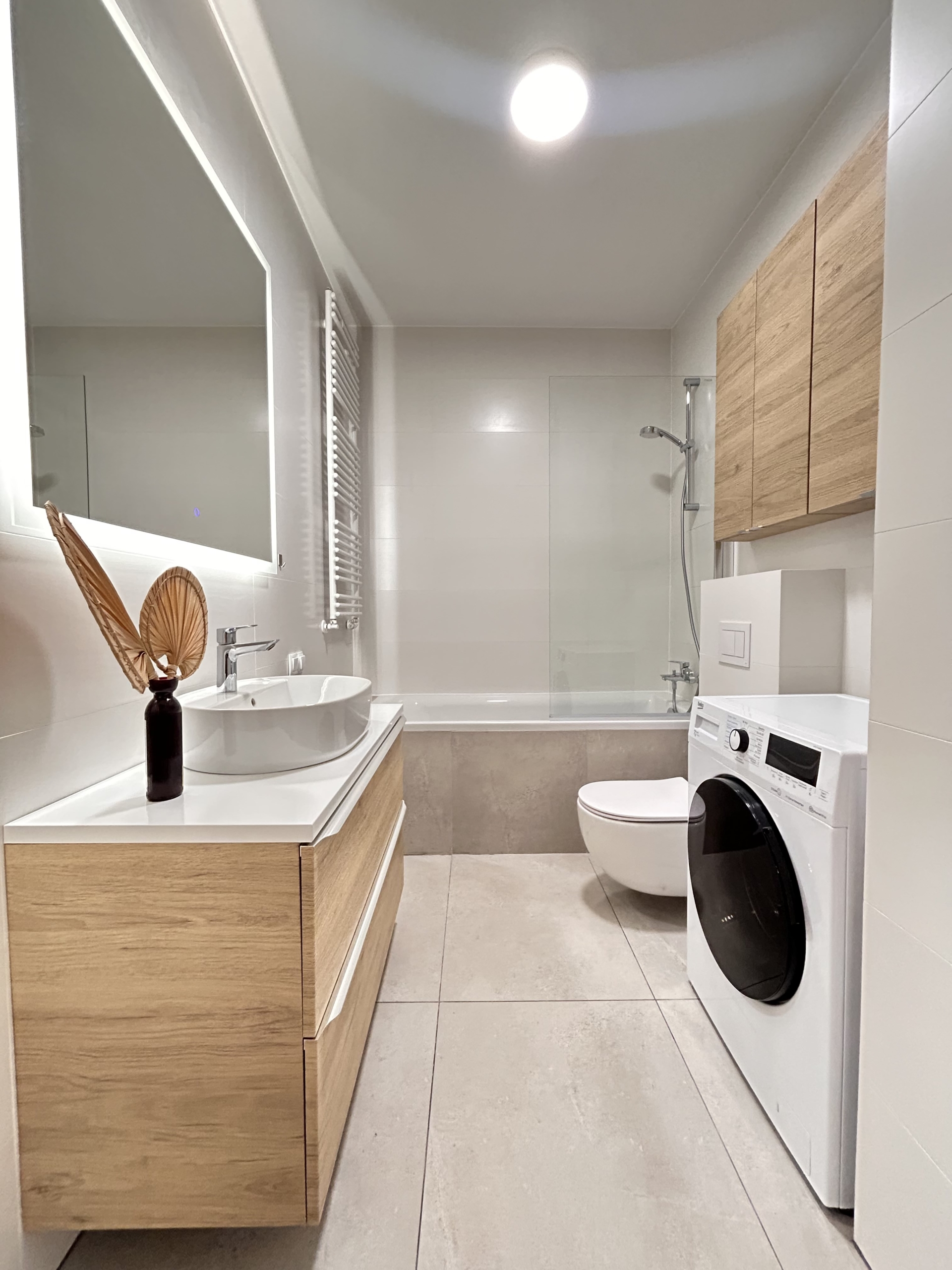Elegancka, w pełni wyposażona łazienka (wanna z prysznicem, pralka, pojemne szafki wiszące oraz szafka z umywalką).