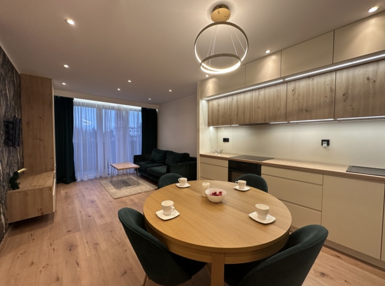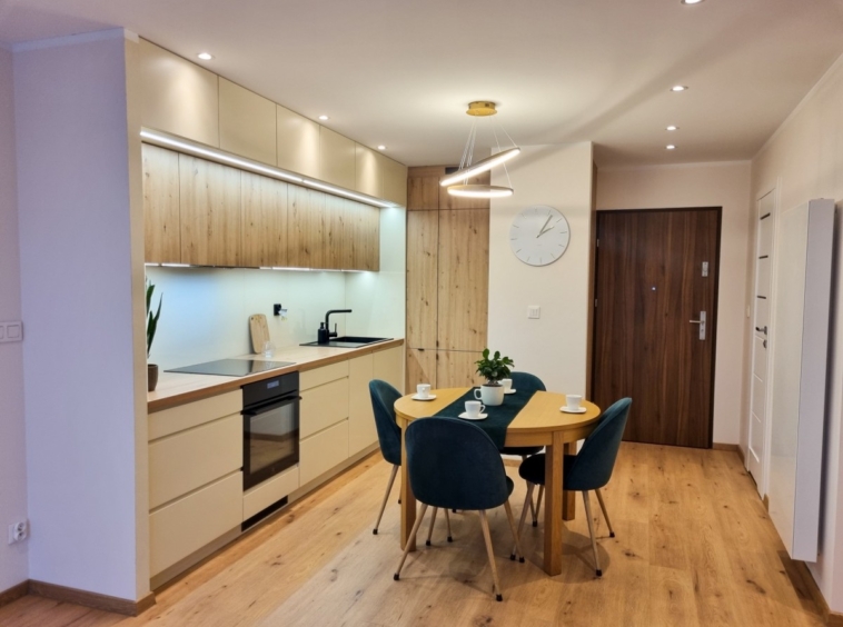 Wyposażenie: kanapa, szafka RTV, stolik kawowy, stół z krzesłami oraz w pełni wyposażona kuchnia — lodówka w zabudowie, piekarnik, płyta indukcyjna, zmywarka i okap.
