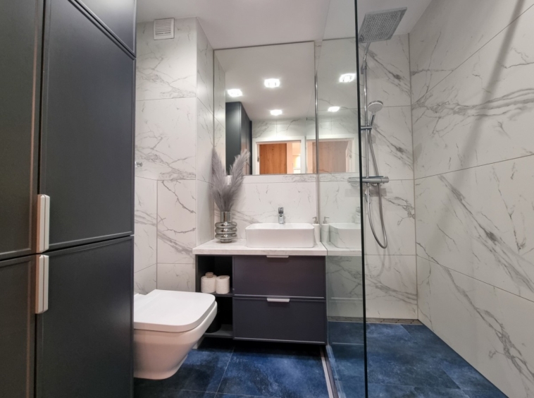 Nowoczesna, z prysznicem typu walk-in, umywalką, WC, dużym lustrem oraz pralką w zabudowie z pojemnymi szafkami nad nią.