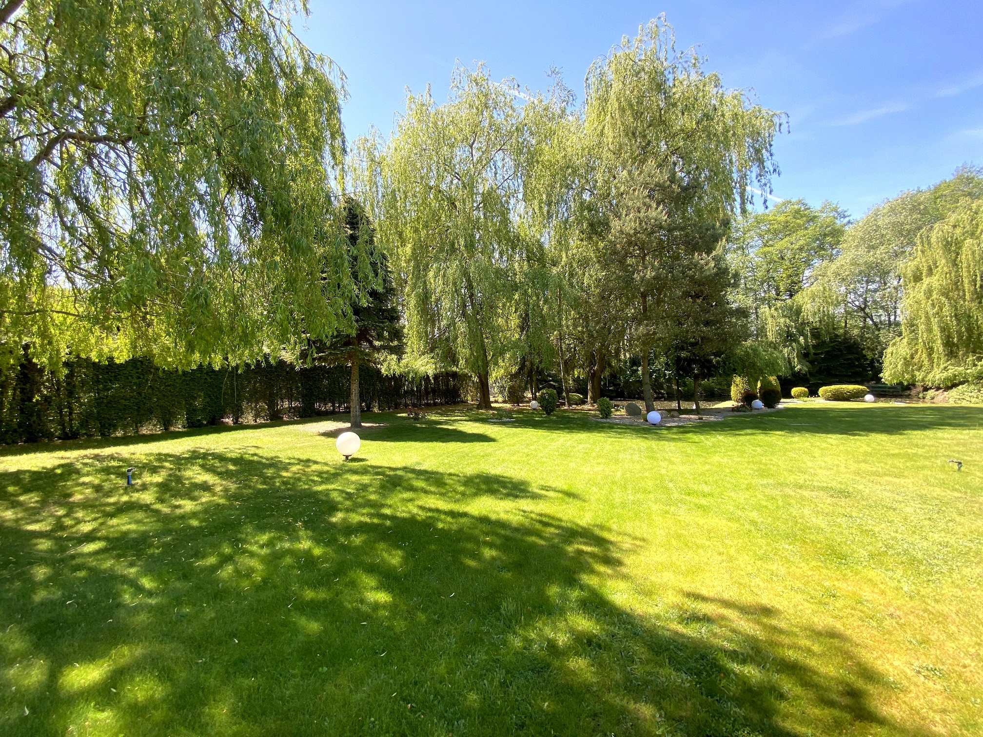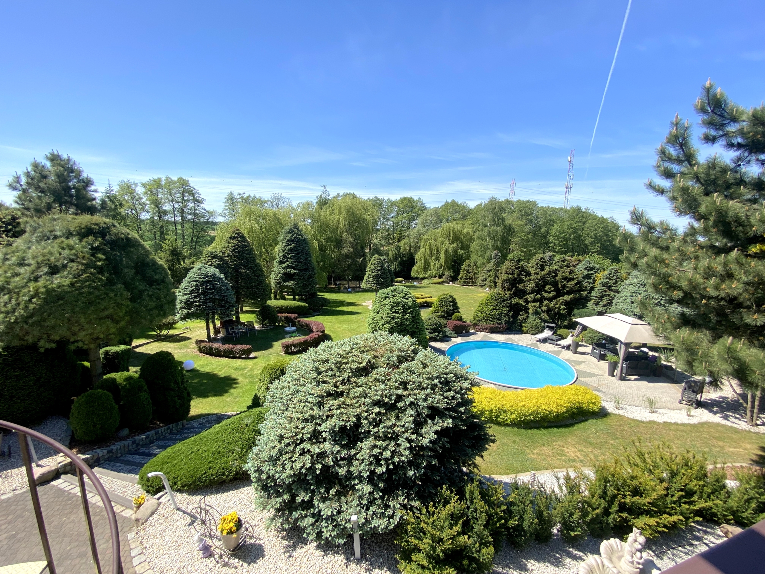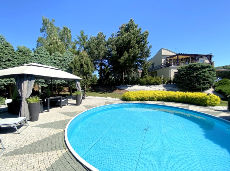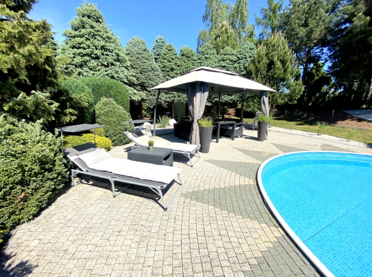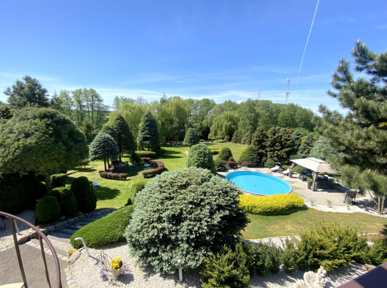 Powierzchnia działki to aż 5500 m2, co zapewnia wiele przestrzeni i możliwości aranżacyjnych. Ogród to prawdziwy raj dla miłośników przyrody – znajduje się w nim wiele gatunków roślin i drzew, a także kolorowe kwiaty. Można tam znaleźć także miejsce na grilla oraz staw z rybami. Dodatkowo na terenie ogrodu znajduje się altana, gdzie można odpocząć i cieszyć się pięknymi widokami. Prawdziwą atrakcją jest basen o średnicy 6,50 m i głębokości 1,50 m, a ponadto domek narzędziowy dla majsterkowiczów ![]()