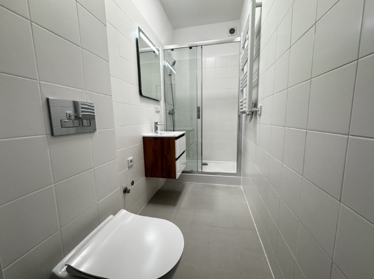 - Wyposażona jest w przestronną kabinę prysznicową, podświetlane lustro, pralkę oraz WC.