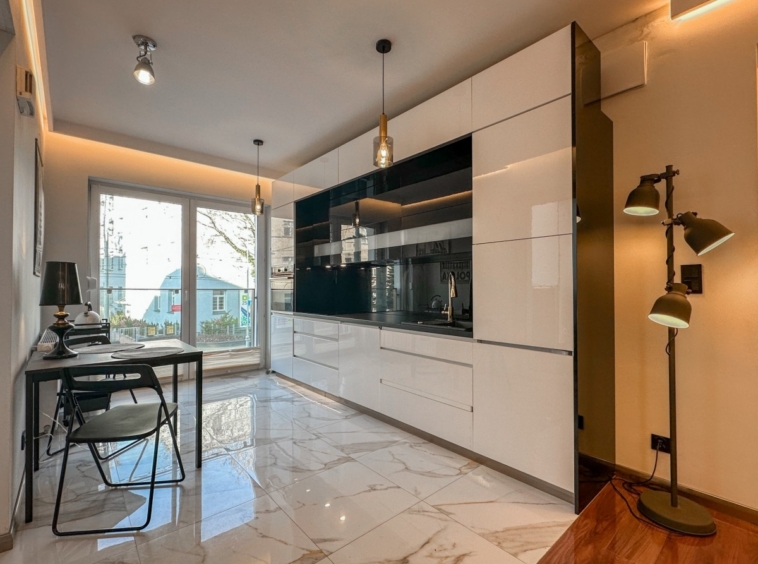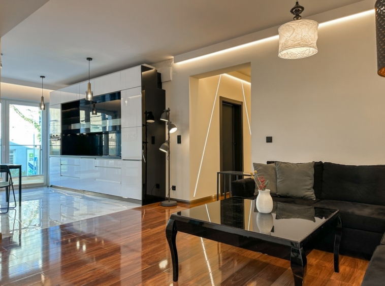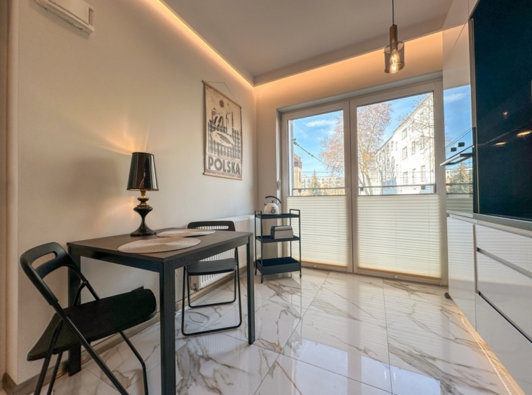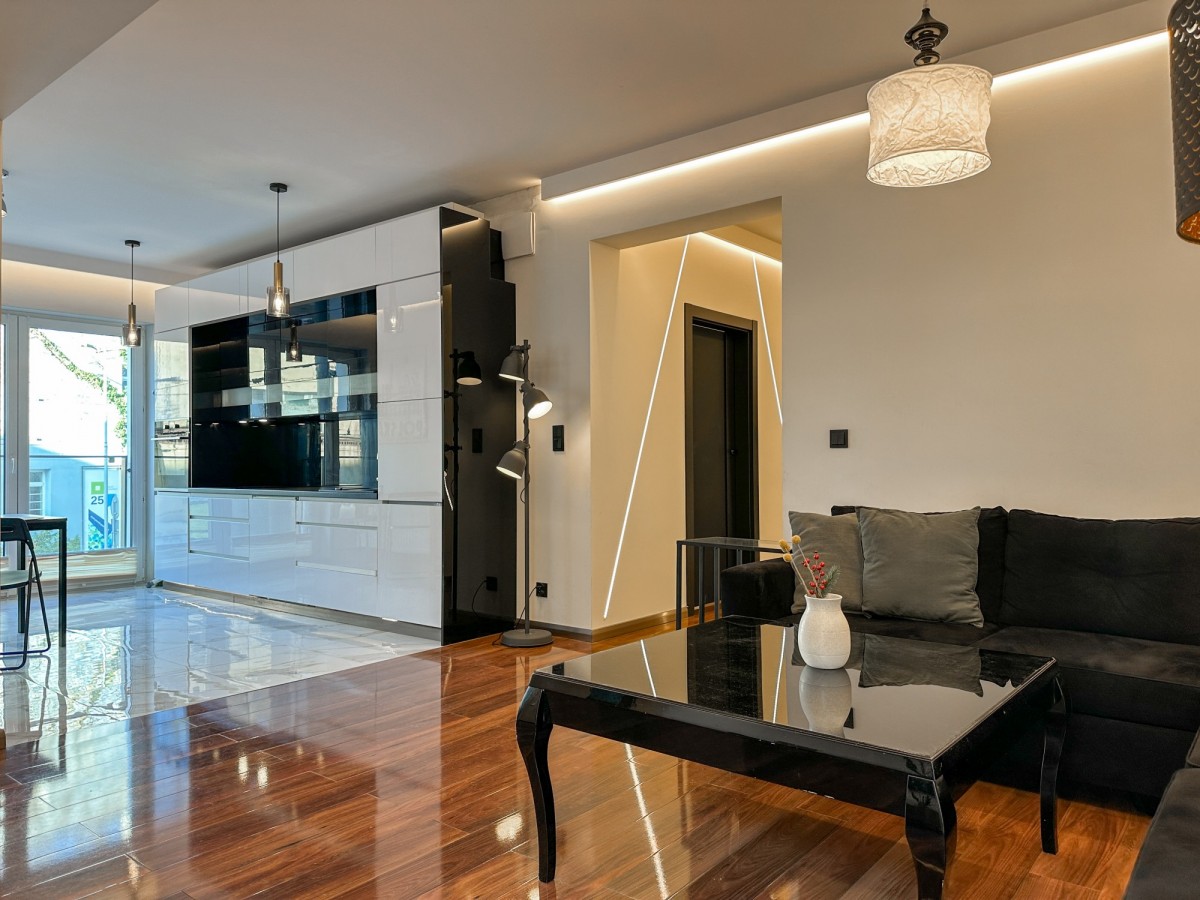 • Przestronny salon z aneksem kuchennym i wyjściem na balkon z dwóch stron