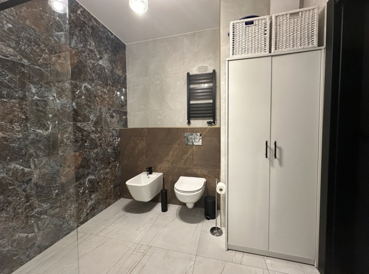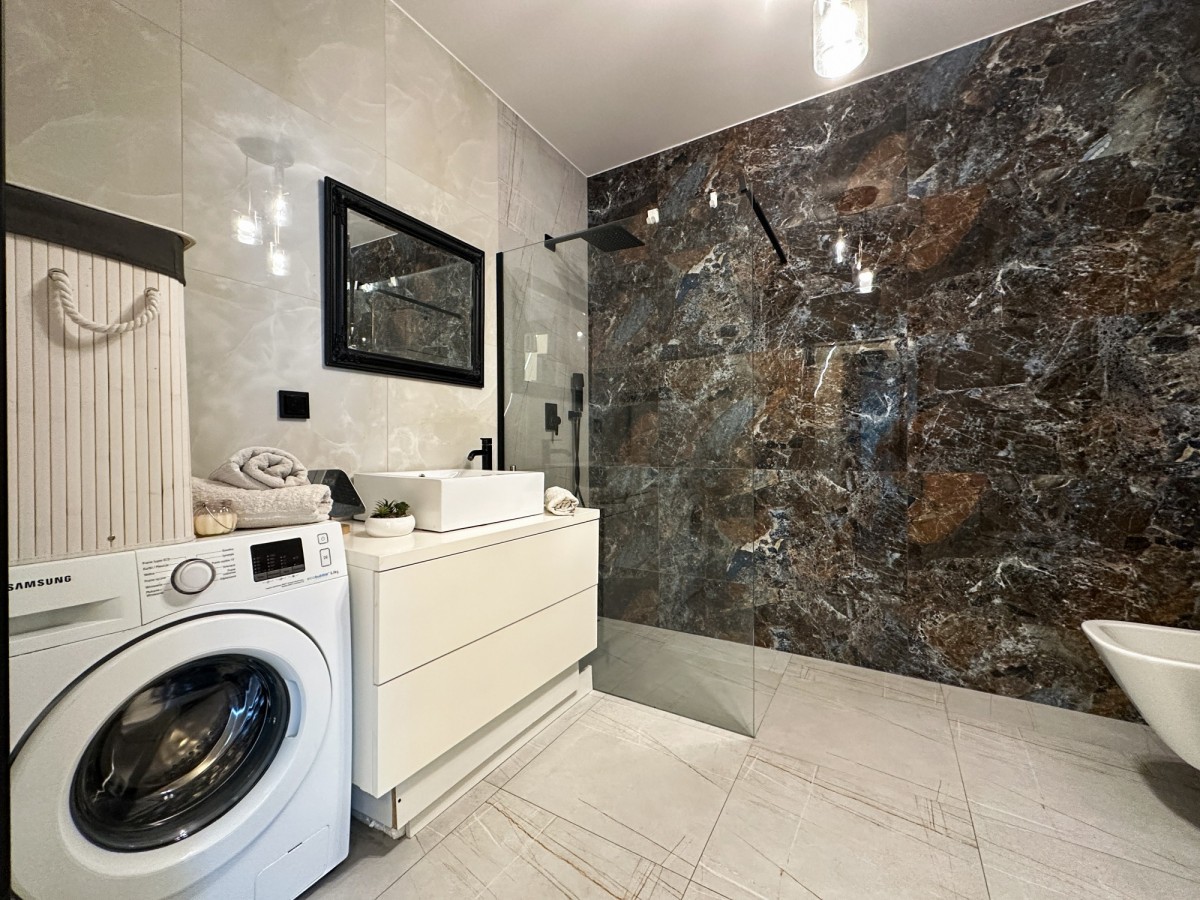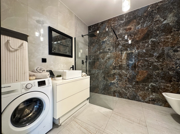 • Łazienka z nowoczesnym prysznicem walk-in i pralką