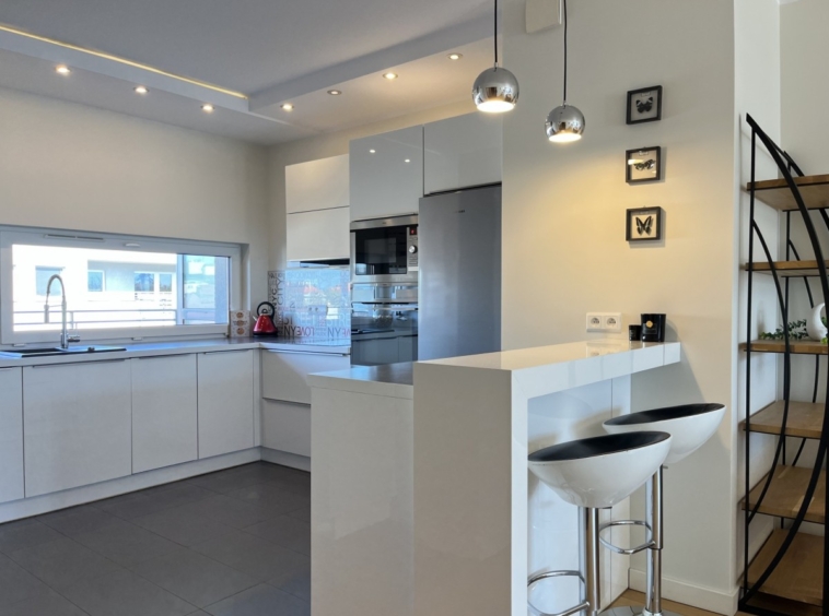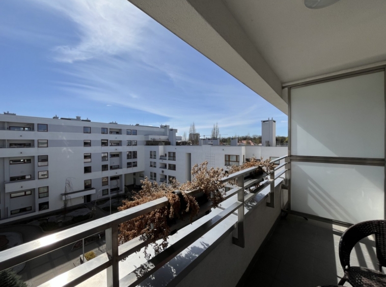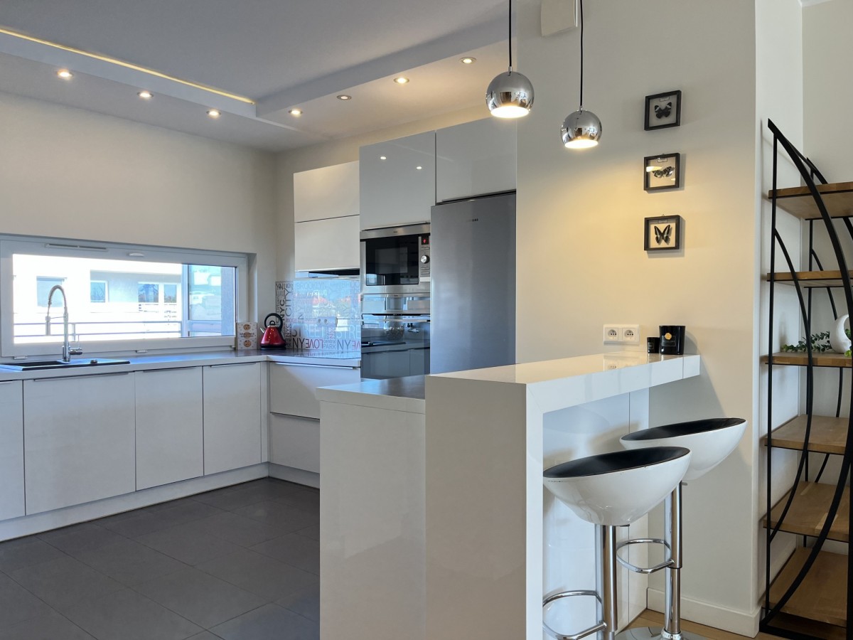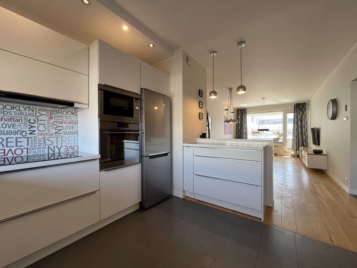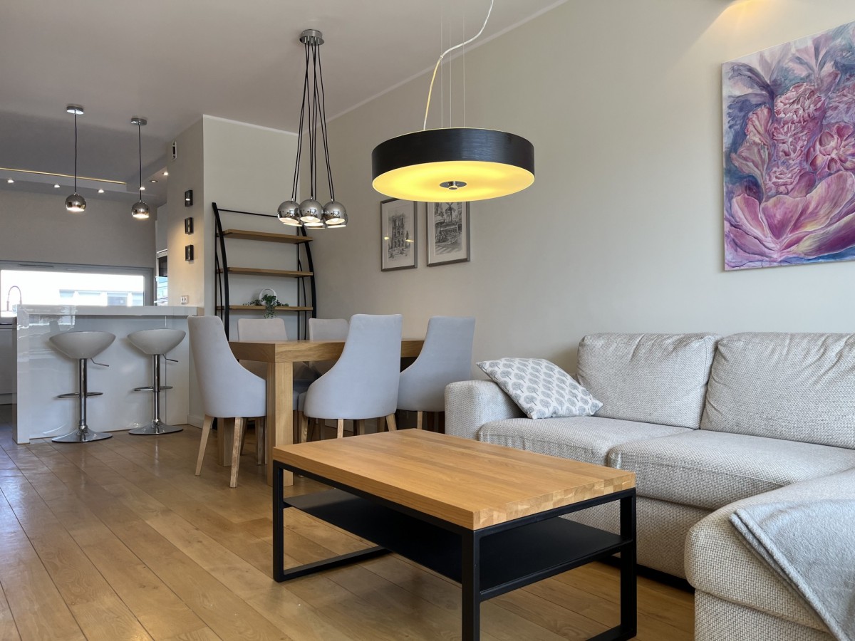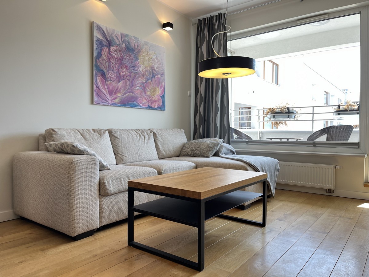 – Jasny salon z aneksem kuchennym i wyjściem na balkon