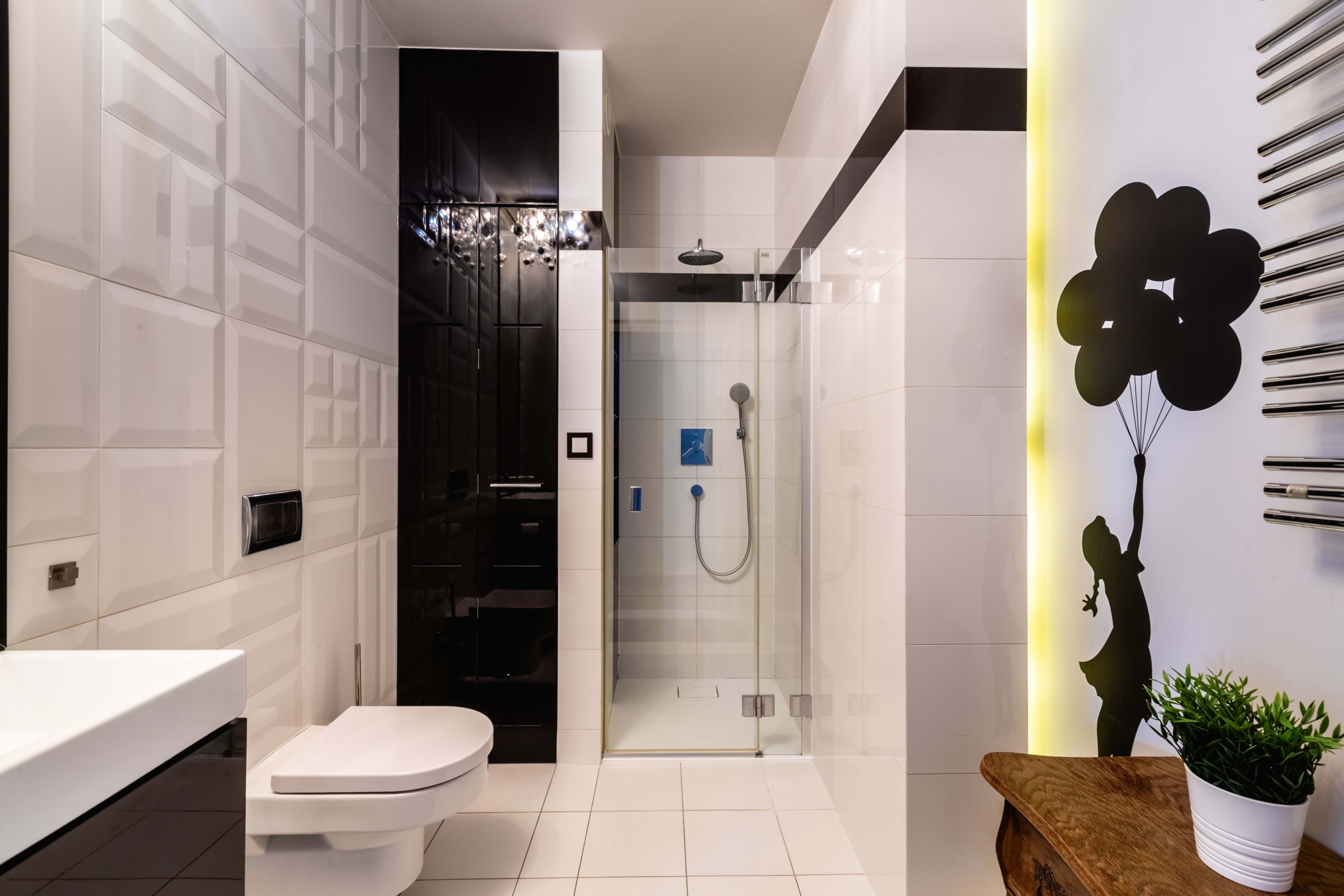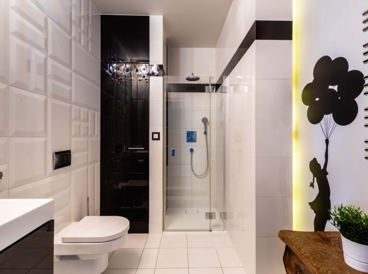 W mieszkaniu znajduje się również toaleta z prysznicem oraz miejscem na pralkę.