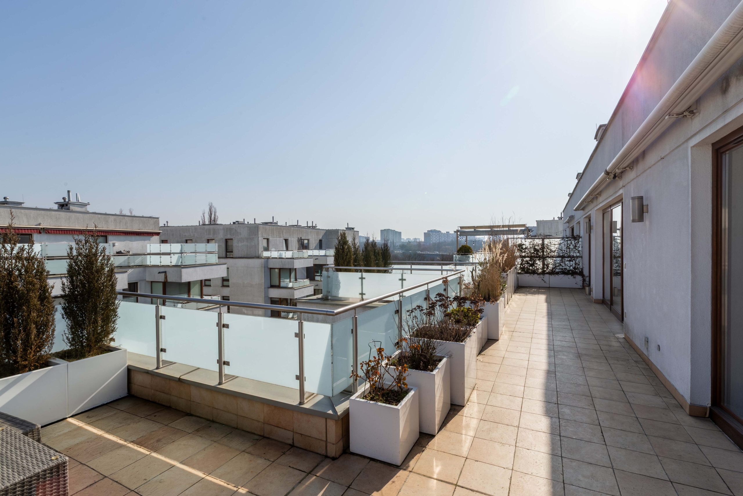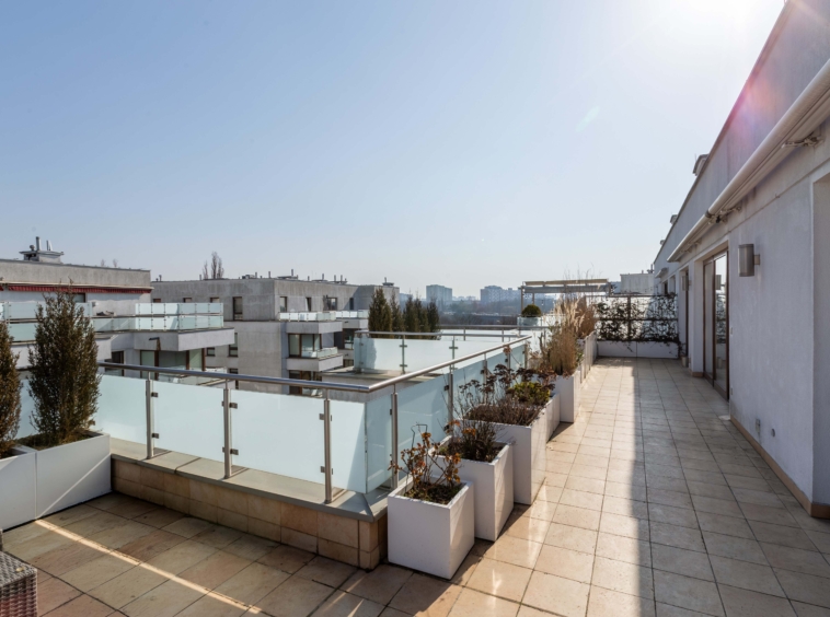 Apartament o powierzchni ponad 111 m² wyróżnia się imponującym tarasem o powierzchni aż 56 m², który stanowi naturalne przedłużenie strefy dziennej. Taras wyposażony jest w elektryczne markizy, które zapewniają komfort korzystania z przestrzeni również w słoneczne dni. To idealne miejsce na poranną kawę, spotkania z przyjaciółmi czy stworzenie prywatnego ogrodu w centrum miasta.
