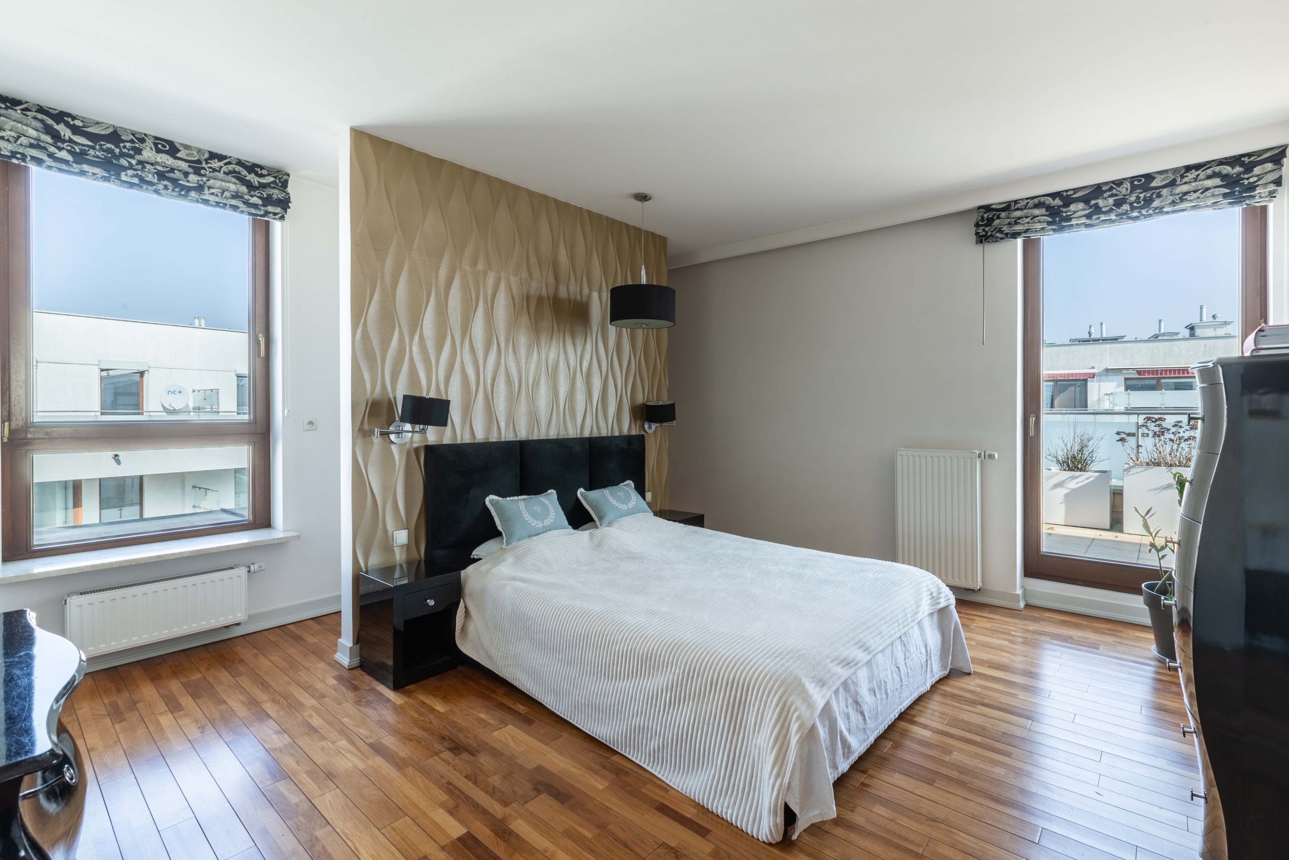 Taras o powierzchni 56 m² to prawdziwa rzadkość w centrum Poznania. Dzięki swojej wielkości daje ogromne możliwości aranżacyjne – można stworzyć tu strefę wypoczynku, jadalnię na świeżym powietrzu czy zielony ogród w donicach. Elektryczne markizy pozwalają komfortowo korzystać z tej przestrzeni nawet w najbardziej słoneczne dni.